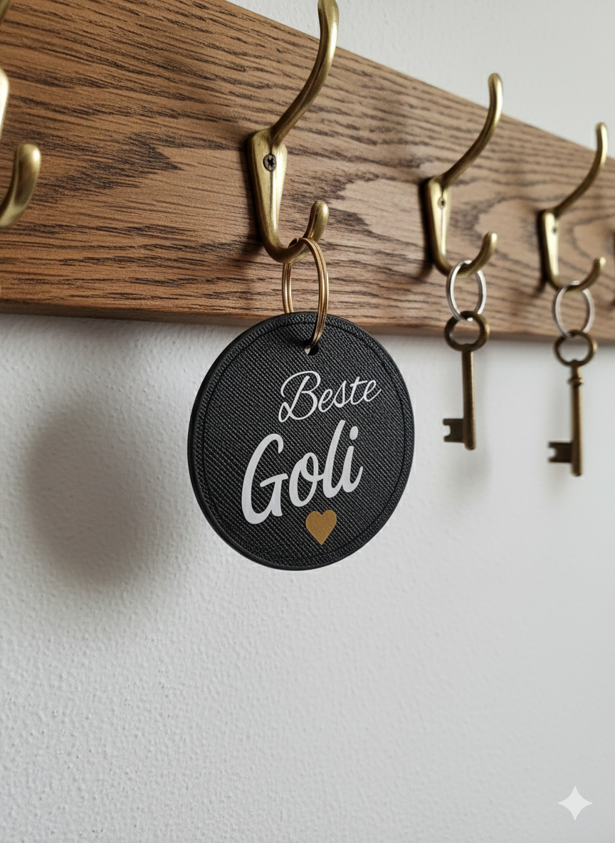 Dieser stilvolle Schlüsselanhänger in Schwarz mit goldfarbenem Herz und der Aufschrift "Beste Goli" ist ein täglicher Beweis Ihrer Zuneigung. Das runde, strukturierte Design ist modern und liegt gut in der Hand.